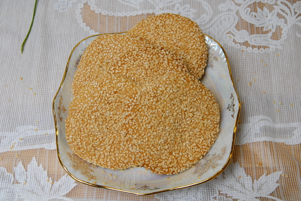 Cookies made of honey and toasted sesame seeds with pistachios on the bottom.